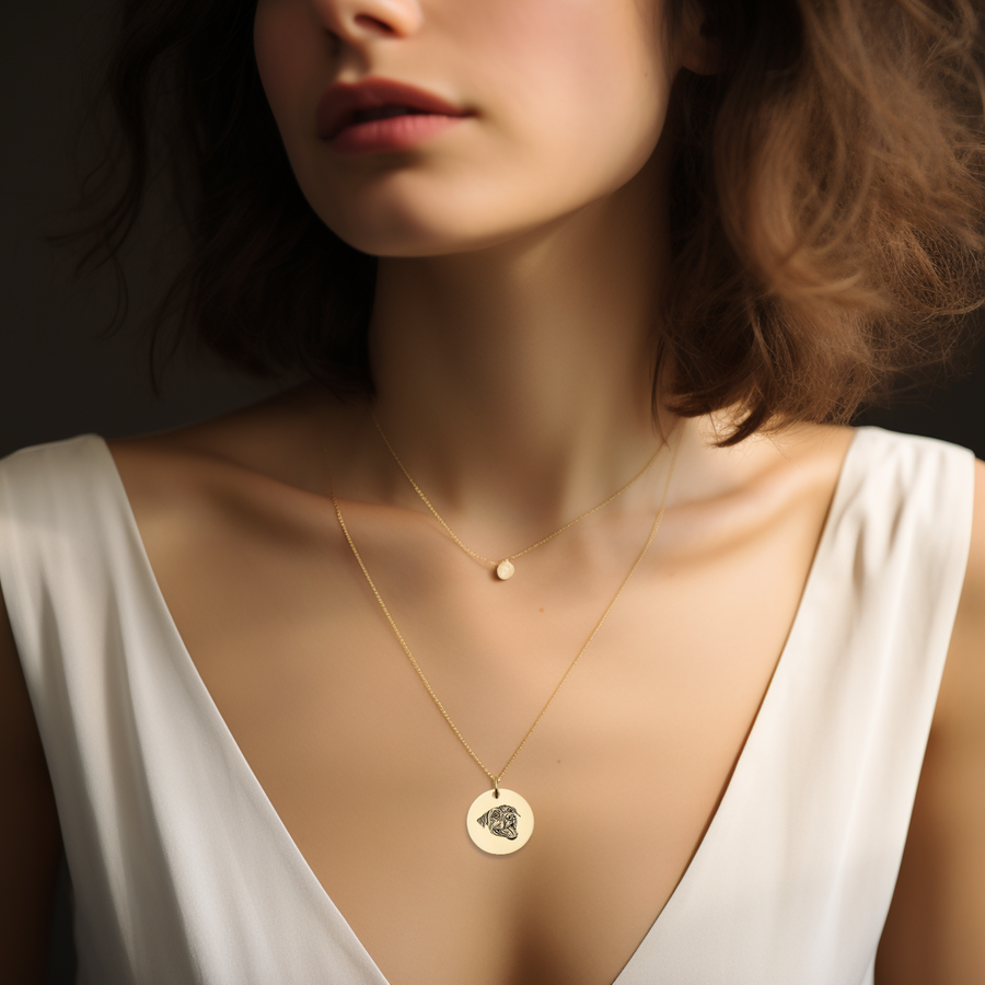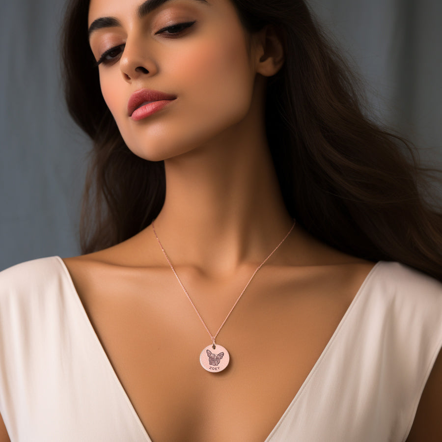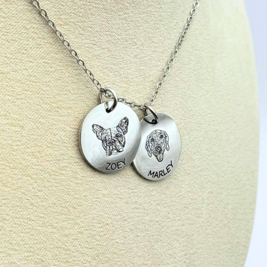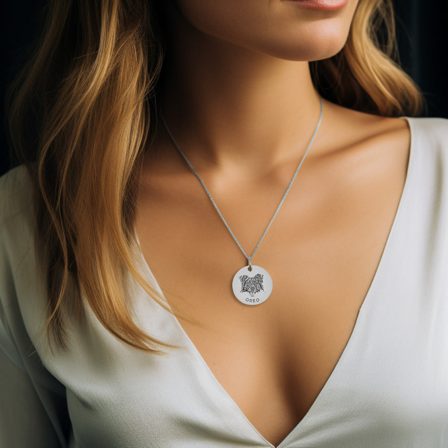 Este elegante collar con retrato de mascota grabado es el accesorio perfecto para aquellos que quieren llevar a su amigo peludo cerca de su corazón en todo momento. Personaliza este collar con el retrato detallado de tu mascota, creando una pieza única que combina belleza y sentimentalismo.