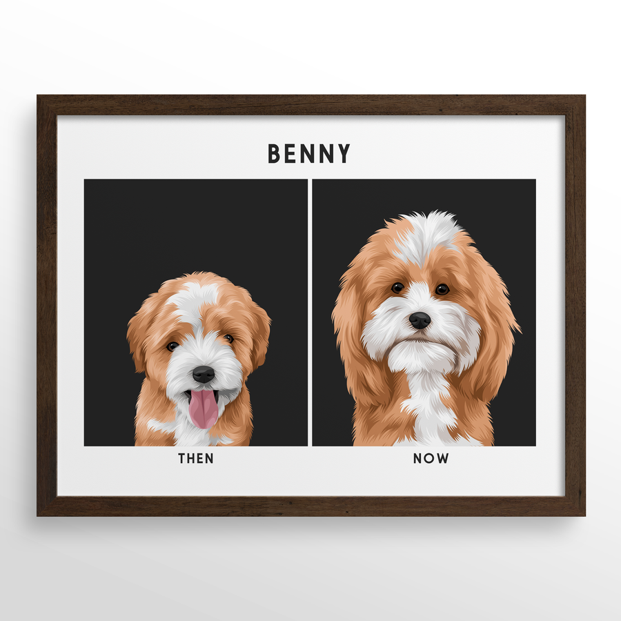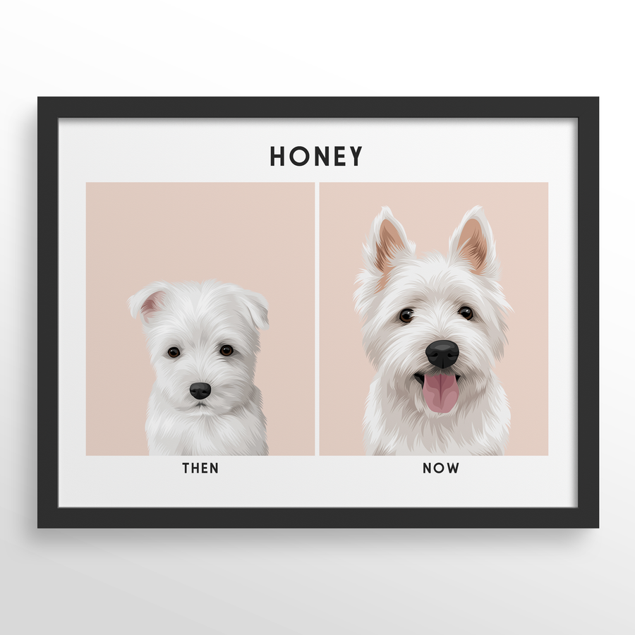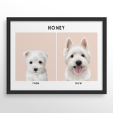 El retrato de mascota personalizado de ayer y hoy es una obra conmovedora que combina dos momentos especiales de la vida de tu perro, gato u otra mascota: su versión joven y su yo actual. A partir de tus fotos favoritas, nuestros artistas crean una ilustración única que refleja el paso del tiempo y el amor eterno que los une.