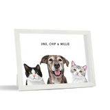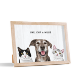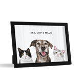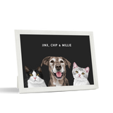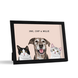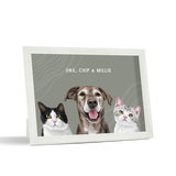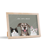 Este retrato personalizado de tres mascotas para escritorio es perfecto para quienes comparten su hogar con más de un amigo peludo. A partir de fotos reales, nuestros artistas crean una ilustración única que refleja la personalidad de cada mascota y celebra el vínculo especial entre ellas. Ideal para decorar tu oficina, estudio o rincón favorito del hogar.